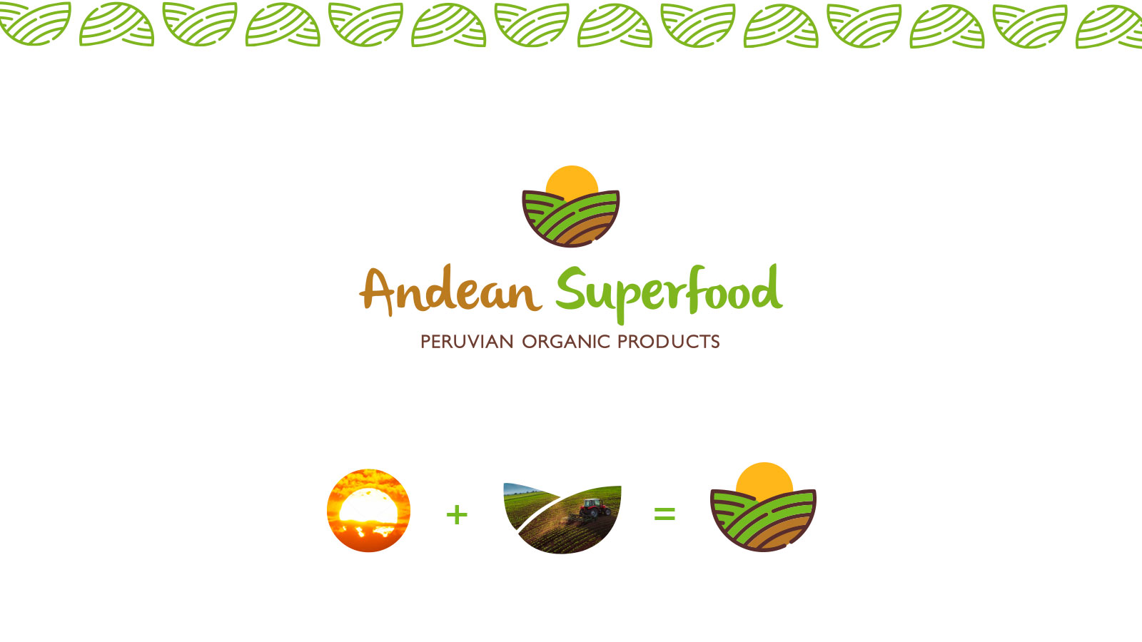 Andean Superfood es una empresa que se encuentra en la Región de Huánuco dedicada a la producción, elaboración y exportación de productos orgánicos usando materia prima de alta calidad con exigencias de BPM, HACCP, POES, además de contar con certificación orgánica para productos frescos y procesados. Para el desarrollo de su identidad partimos del concepto de "tierra única" ya que Andean Superfood se encuentra entre la sierra y selva peruana de tal manera tomamos la síntesis del sol y la tierra "única" de Huánuco construyendo un isotipo fusionando estos elementos. Para la línea gráfica desarrollamos una textura tomando como patrón la hoja, también se desarrollo síntesis de campos con formas orgánicas teniendo en cuenta una paleta de colores verdes y colores tierras.
