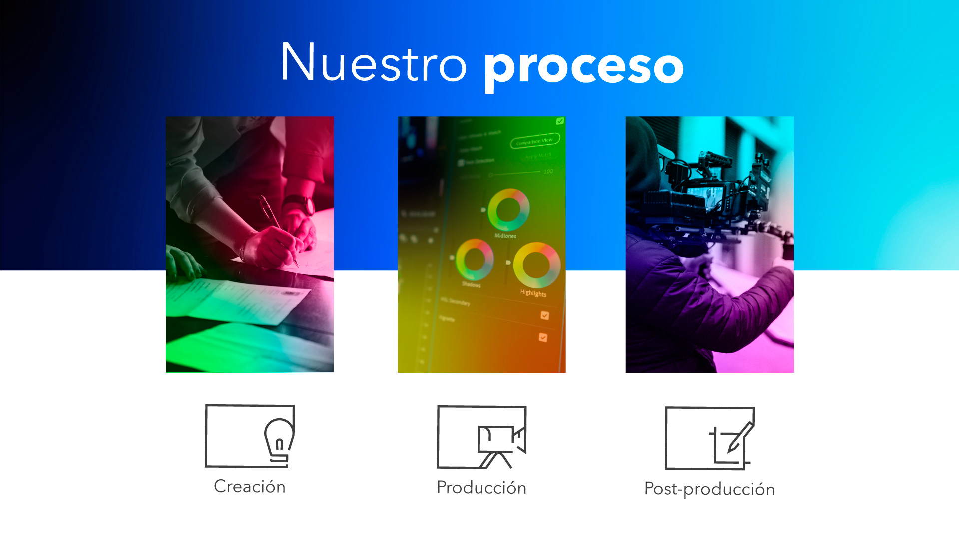 Para el diseño del logotipo, buscamos un elemento distintivo y funcional dentro de la producción, por lo cual elegimos la “Claqueta” ya que nos asiste en la sincronización de imagen y sonido, además, siempre tiene presencia delante de la cámara al inicio de cada toma. Tomando como concepto el espacio audiovisual utilizamos el recuadro como elemento versátil el cual representa espacios físicos como diferentes movimientos que puedan tener las cámaras en acción. Para la elección de los colores, decidimos utilizar los colores blanco, azul y negro, los cuales se muestran por medio de un degrade, con el cual logramos transmitir la fluidez y versatilidad.